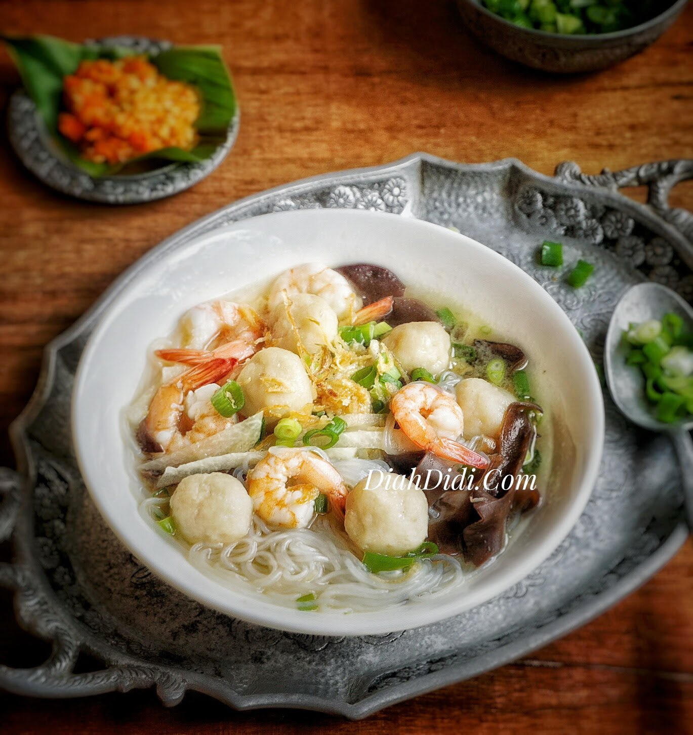 Untuk Kuahnya memakai kaldu udang. Pilih udang yang masih segar juga agak kuah tidak terasa amis. Selain itu bumbu utama adalah bunga Sedap Malam. Itu bisa di beli di pasar atau di supermarket ada. Agar lebih sedap, bisa di tambahkan sedikit kecap ketika menyantapnya, dan jangan lupa sambal rawitnya ya...hemm...seger banget. Cobain yuk teman - teman..ini dia resepnya ya. Untuk Yodha, adonan sama aku buat Bakso Goreng, karena dia lebih suka Bakso Ikan di goreng. Kalau rebus kurang suka. Bisa jadi menu diet juga lho...hihi. Aku cuma pakai sedikit minyak kedelai untuk menumis bumbu, lainya di rebus semua. Menu diet ala aku..kudu enak lah..! Lol...