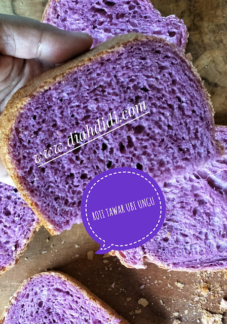 Roti Tawar Ubi UnguBahan :400 gram Tepung Terigu Protein Tinggi200 gram Ubi Ungu kukus, haluskan35 gram gula pasir1 buti rtelur ukuran kecil saja150 ml susu cair1 1/2 sendok teh ragi instan1/2 sendok teh garam60 gram margarin atau mentegaCara Membuat :Aku pakai bread maker, jadi stepnya masuk susu dan telur ke wadah, tuang tepung, gula, ubi dan ragi, lalu biarkan Bread maker bekerja hingga setengah kalis. Masukkan Mentega dan garam, lalu akan di uleni lagi hingga kalis dan elastisDiamkan 1 jam hingga mengembangBuang gas, gilas hingga udara keluar semua, agar serat roti cantik, jika masih banyak udara terperangkap di adonan, hasil roti bisa berlubang-lubang besaraku aja tadi udah di gilas, masih ada dech udara dikit-dikit..keliatan dari lubang-lubang di rotinya itu lho teman-teman.Gulung adonan, masukkan kembali ke wadah Bread MakerDiamkan kembali hingga mengembang satu jam lagi kira-kiraPanggang hingga matang di Bread MakerJika mau di uleni manual, sama prosesnya, uleni semua bahan kecuali garam dan margarin hingga setelah kalis, masukkan garam dan margarin, uleni kembali hingga elastis, selanjutnya sama langkahnya untuk perlakuan dan proofingnya, selanjutnya, panggang di oven biasa.Video menyusul ya, belum di upload ke you tube..:D
